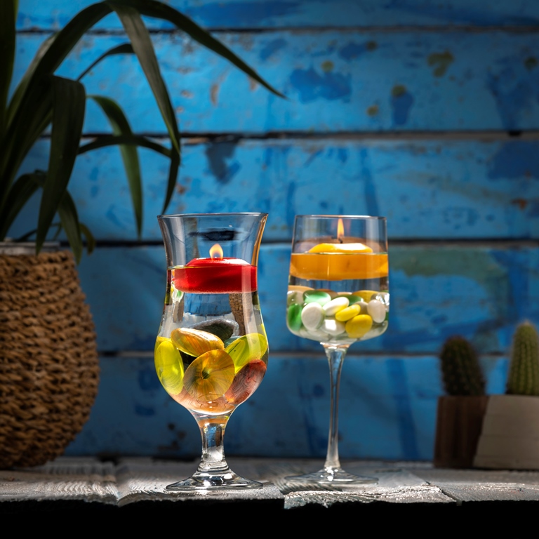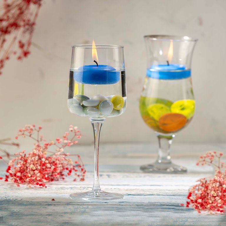Yüzen Mum seti içinde ihtiyacınız olan herşey bir arada. Yapmanız gereken tek şey kutu içinden çıkan bardağınızı konseptinize uygun şekilde süsleyip su eklemek ve mumunuzu koymaktır.